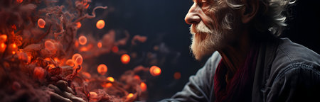 An elderly man with a wise expression stands against a striking gradient of fiery orange and mellow yellow. The highgloss background reflects the warm colors giving a sense of.
