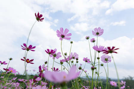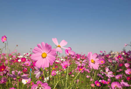 Cosmos Flower field with sky background,Cosmos Flower field blooming spring flowers season