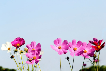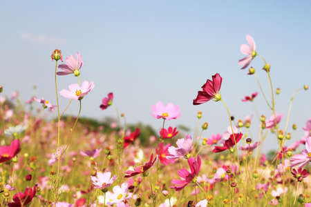 Cosmos flowers blooming in the garden with blue sky background.