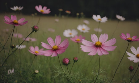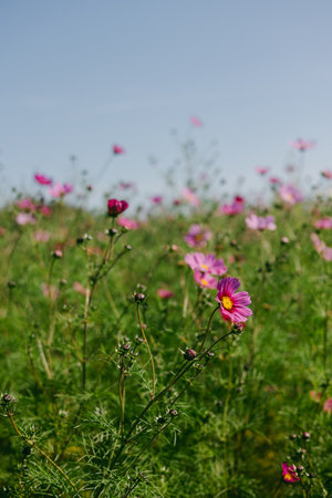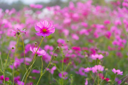 Pink cosmos flower blooming cosmos flower field, beautiful vivid natural summer garden outdoor park image.