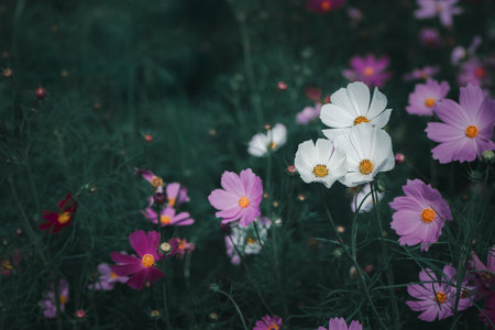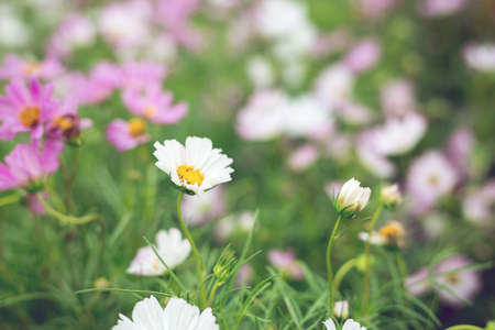 Cosmos flowers blooming in the garden, vintage color tone.
