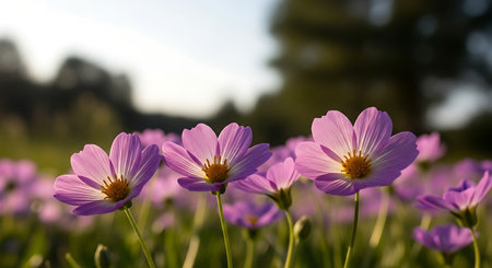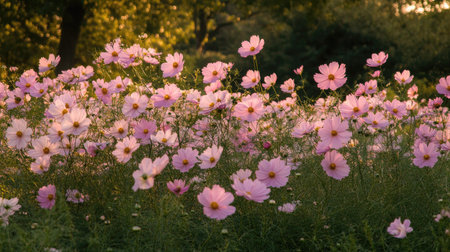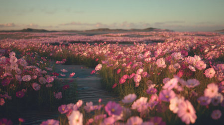 A serene field filled with delicate pink flowers, basking in soft sunlight. This captivating scene captures the beauty of nature, perfect for seasonal themes.