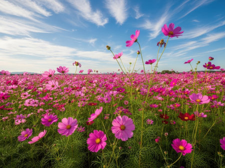 A stunning view of a vibrant field filled with blooming pink and white flowers under a bright blue sky adorned with fluffy clouds.