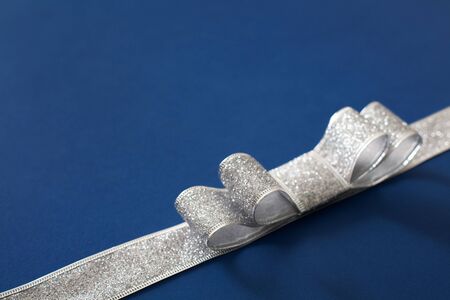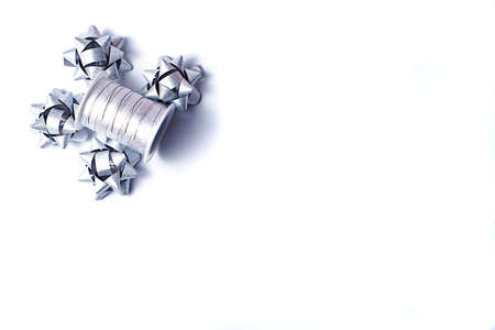 Decorative silver bows on white background. Christmas or birthday backdrop. Celebration and party concept. Flat lay style. Image is with copy space
