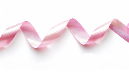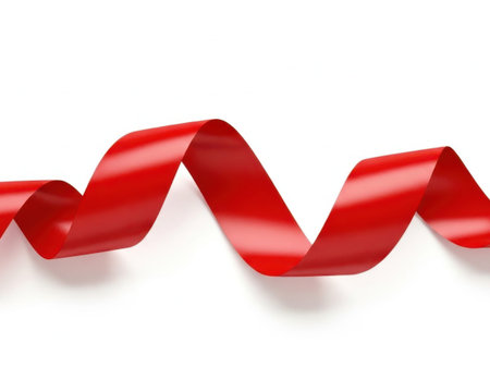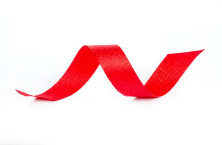 This image features a single, vibrant red ribbon elegantly curled and isolated against a clean, white background. The ribbon is the central focus, creating a striking contrast with the plain white backdrop. The image is ideal for various design and decorative purposes.