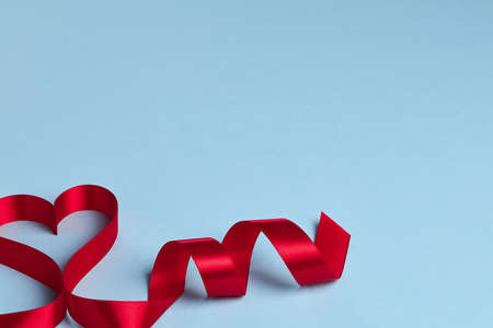 Red satin twisted ribbon on red background. Photo with copy blank space.