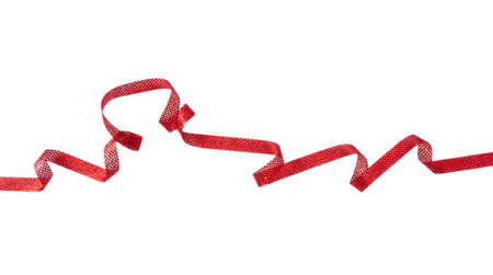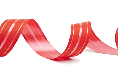This image features a vibrant red ribbon elegantly curled and isolated against a clean, white background. The ribbon's glossy texture adds depth and dimension to the overall composition, making it a striking visual element. Ideal for various design and decorative purposes.