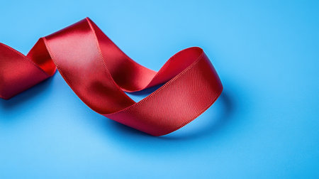 A close-up of a red satin ribbon gift box, placed on a blue background, perfect for holiday gift wrapping concepts with plenty of copy space.