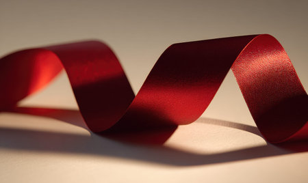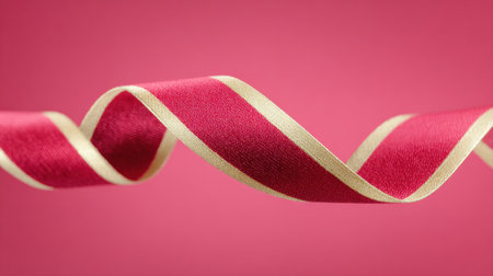 A close-up shot of a glossy red ribbon elegantly curling and twisting across a rich red backdrop, creating a sense of luxury and celebration.