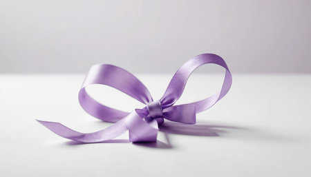 A detailed, macro view of a lustrous purple ribbon formed into an elegant bow, highlighting the texture and sheen of the satin material.