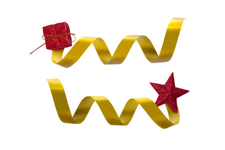 Gold silver and red xmas stars and ribbons and thread for gifts packages on white