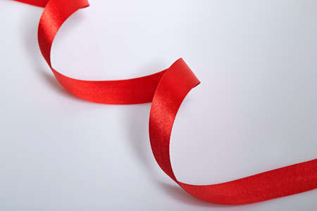 A red ribbon is curled up on a white surface. It is curled up and has a shiny appearance