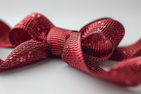A detailed macro shot of a shiny, textured red ribbon tied into a bow, with subtle sequin accents and a blurred backdrop.