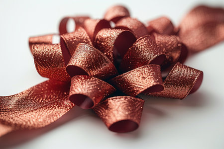 A detailed macro shot of a lustrous rose gold ribbon, intricately tied into a decorative bow, resting on a clean white surface.