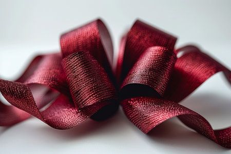 A detailed macro shot of a lustrous dark red ribbon tied into a decorative bow, set against a plain white surface.