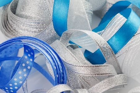 Isolate of silver ribbons and four bows. Ribbons for gift wrapping. flat lay.