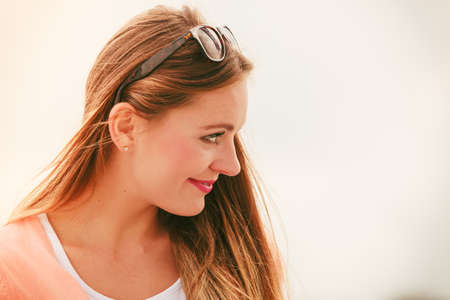 happy young beautiful woman face closeup and portrait outdoor at sunny day
