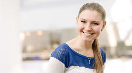 Portrait of beautiful woman in light mall. She look at camera and smile.