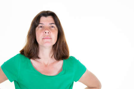 Joyful lmiddle aged lady wearing beige blouse stands on light background