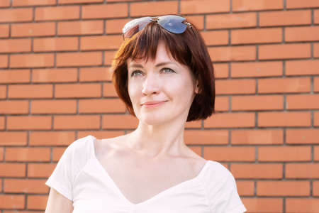 Portrait of a middle-aged woman in front of a red brick wall. Walking around the city on a summer day. The woman looks away thoughtfully.