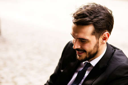 Portrait of handsome successful man sitting outside at terrace in elegant suit