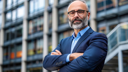 A joyful and confident mid-aged senior business executive is seen standing in a sleek modern office, radiating professionalism, leadership qualities, and experience, ideal for business success