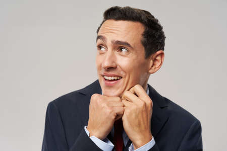 Confident Smiling Businessman in Black Suit with Tie Posing Against Gray Background for Success