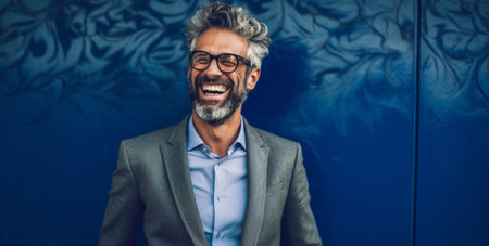 Confident Mature Entrepreneur with Gray Hair and Glasses, Dressed in Formal Attire, Smiling Happily