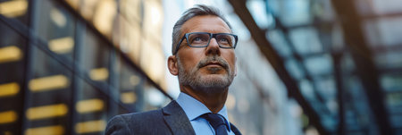 A middle-aged businessman against the backdrop of skyscrapers in the business district of a modern city. The citys energy fuels the businessmans ambition and determination.
