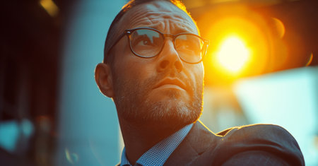 Portrait of a pensive businessman in suit and glasses looking into the distance with the sun in the background