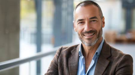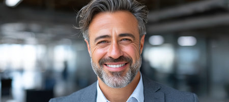 Confident Mature Businessman with Graying Hair Smiling in Modern Office, Exuding Success