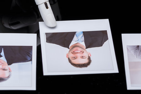 top view of the hands of a woman making a selection of a collection of pictures on a selection process of images on a desk after a photoshoot - focus on the center of the image