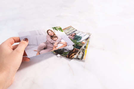 woman sitting at desk and looking at printed photos, remember nostalgia for a day of rest. photography cards, background. Mock up.