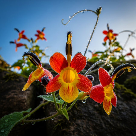 Dew covered orange flowers bloom on a green plant against a dark background showcasing intricate petal details and vibrant colors.