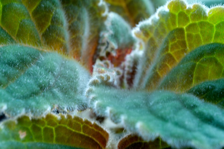 First snow falling gently on Streptocarpus, a few snowflakes drifting slowly and settling on the leaves; fresh air, natural.