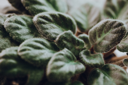 Violet saintpaulias green leaves or African Violets, macro shot, house plant and nature background, toned