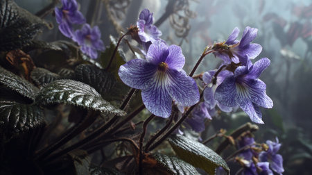 A close-up view of lush green leaves highlighted by beautiful purple flowers, showcasing the harmony of nature's colors and textures. Ideal for botanical themes.