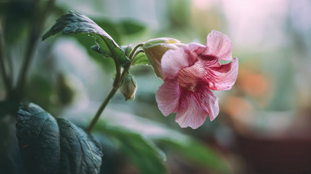 A Single Pink Flower with Delicate Veins Surrounded by Green Leaves