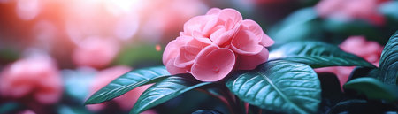 Delicate pink flowers thrive in a vibrant tropical forest as warm sunlight shines through the dense foliage, illuminating the scene and creating a serene and enchanting atmosphere.