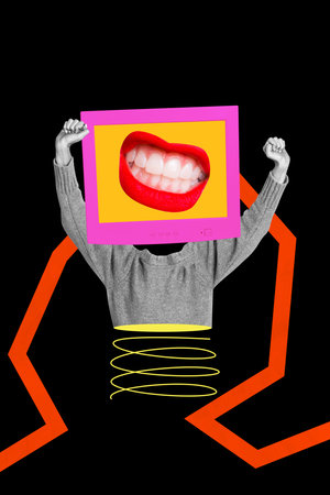 Trend artwork composite sketch image collage of caricature person body young woman mouth tv monitor display propaganda fake news talk