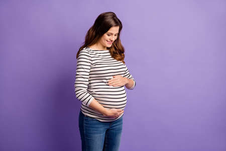 Photo of charming lady waiting baby dressed striped shirt hugging looking tummy isolated violet color background