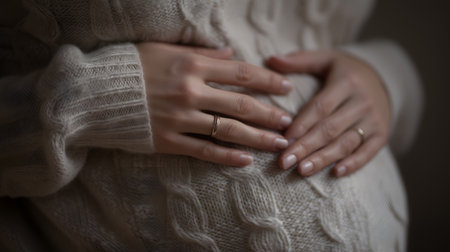 Close-up of hands on abdomen in cozy sweater. Ring detail and warm lighting evoke themes of maternity, tenderness, and personal reflection.