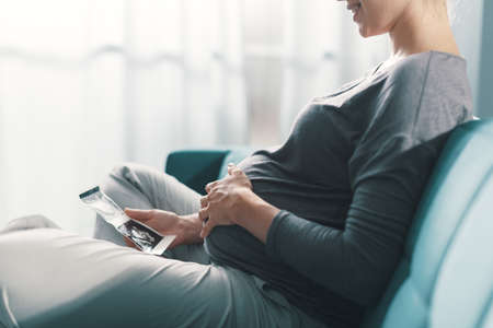 Pregnant woman relaxing on the sofa at home and watching ultrasound images of her baby, motherhood and pregnancy concept