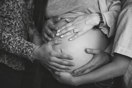 Pregnant woman: father's hands on the belly. Black and white image