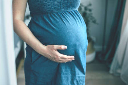 Pregnant woman in jeans blue dress touching her belly in bedroom