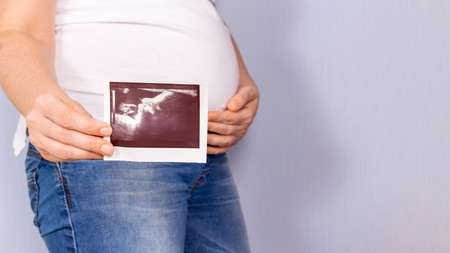 Pregnant woman holding ultrasound image. Concept of pregnancy, health care, gynecology, medicine. Young mother waiting for the baby. Place for text, indoors.