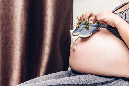 Closeup pregnant female holding cute childish booties on huge tummy relaxing at home awaiting baby