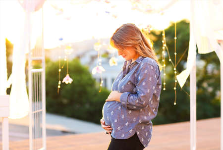 Close-up of pregnant belly outdoors copyspace. Pregnancy and motherhood concept.