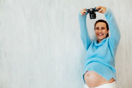 beautiful pregnant woman takes a picture on the camera