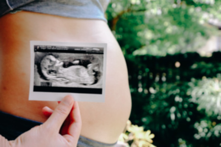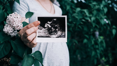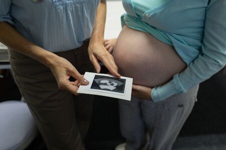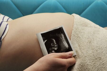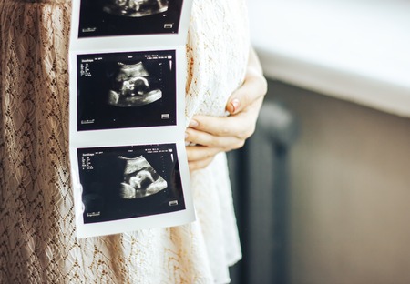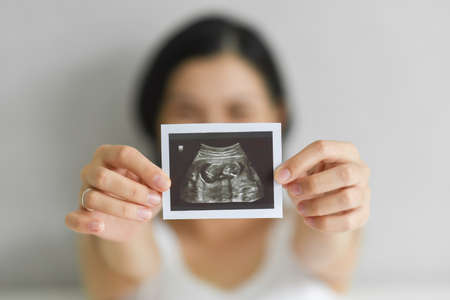 Ultrasound image pregnant baby photo. Woman holding ultrasound pregnancy picture. Pregnancy, medicine, pharmaceuticals, health care and people concept